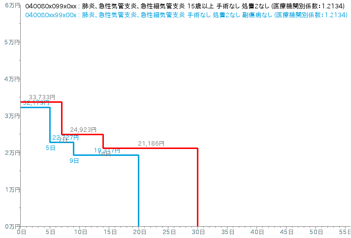 診療報酬制度改定の際に各DPCコードの日当点が変化したり、あるいは新しい分岐が追加されてDPCコードが変化します。 決定したDPCコードと旧制度のDPCコードとの対応がつく場合に限りますが、 現在のDPCコードの階段チャート(赤線)と旧制度のDPCコードの階段チャート(青線)を重ねて表示する機能があります。